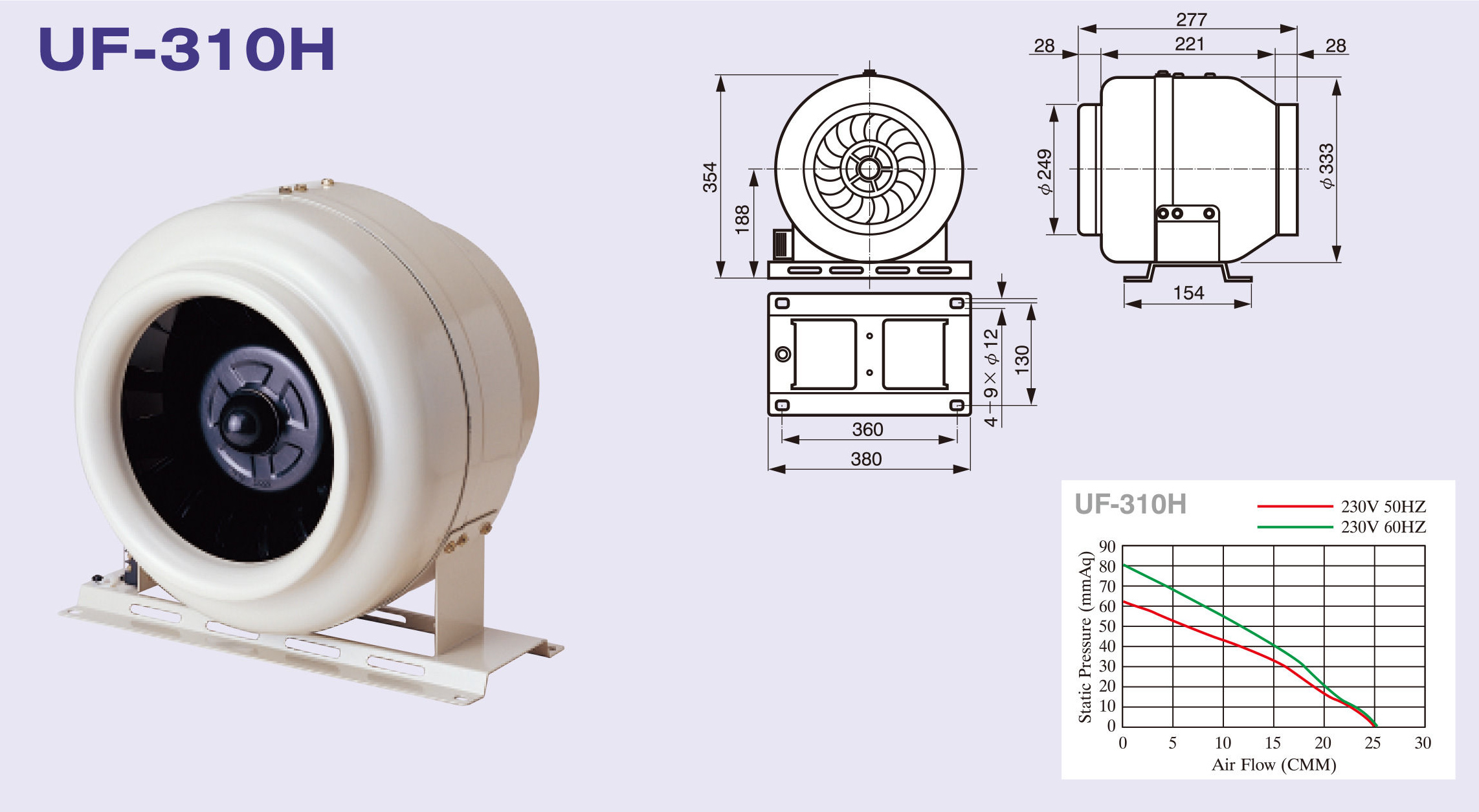 | UF-310H | 230 | 50 | 1 | 2 | 2050 | 385 | 2 | 25 | 62 | 67.4 | 12.8 |